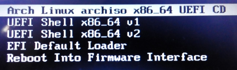 Setelah sukses langkah selanjutnya Anda reboot, dan pastikan boot-order pada Bios Anda sudah tertuju pada USB. Jika diperangkat keras (Hardware) Anda terdapat UEFI, biasanya pilihan Archlinux Anda akan seperti gambar berikut: