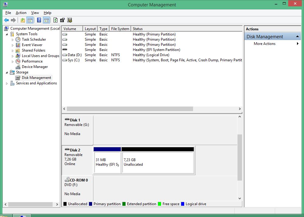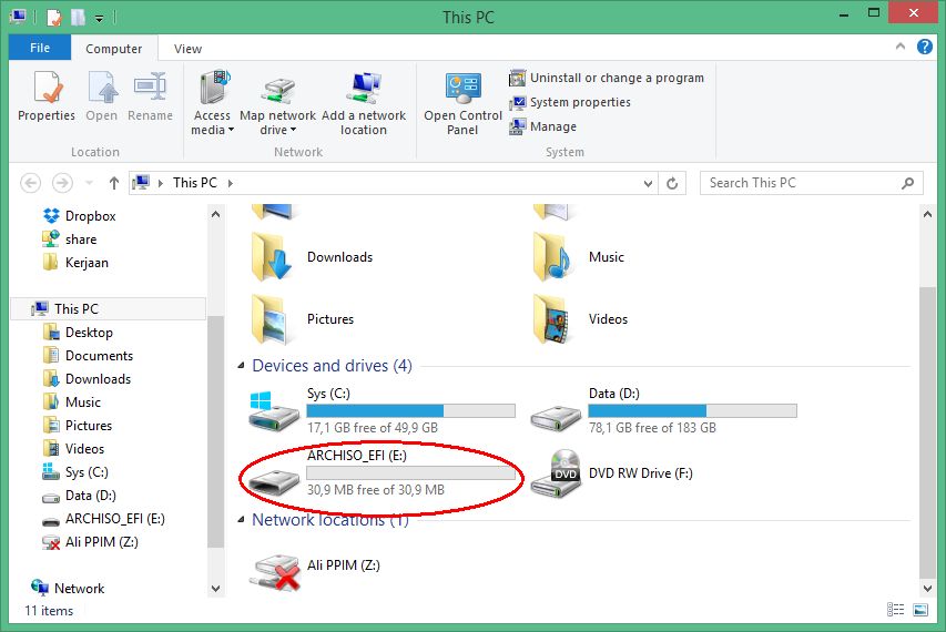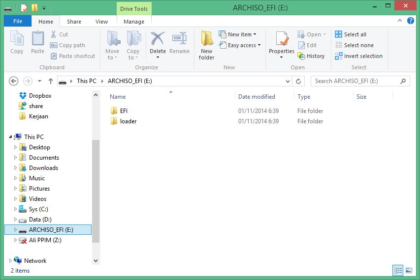 Bisa saja Anda teruskan dengan memilih Arch Linux archiso x86_64 UEFI CD, maka itu akan tertuju pada Archlinux 64bit, dan Anda tetap bisa melanjut menginstal Archlinux. Akan tetapi lebih baik disarankan, pertama matikan UEFI Anda di Bios, biasanya yang tertera tulisan boot-secure. Jika UEFI sudah dimatikan booting Arch masih seperti gambar di atas, langkah kedua Anda hapus direktori EFI pada FD Anda. Caranya masuk ke Windows Anda kembali dan masukan FD Anda.Ketika memasukan FD Anda tidak menemukan drive USB Anda? Coba masuk Disk Management, caranya dengan mengklik kanan pada My Computer, lalu pilih Manage.