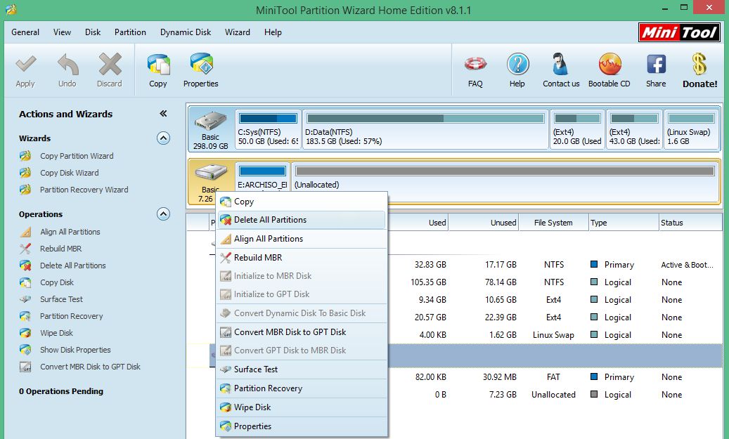 Jangan khawatir, cara memperbaikinya sangat mudah. Anda buka Partition Wizard lalu hapus seluruh partisi pada FD Anda seperti gambar berikut: