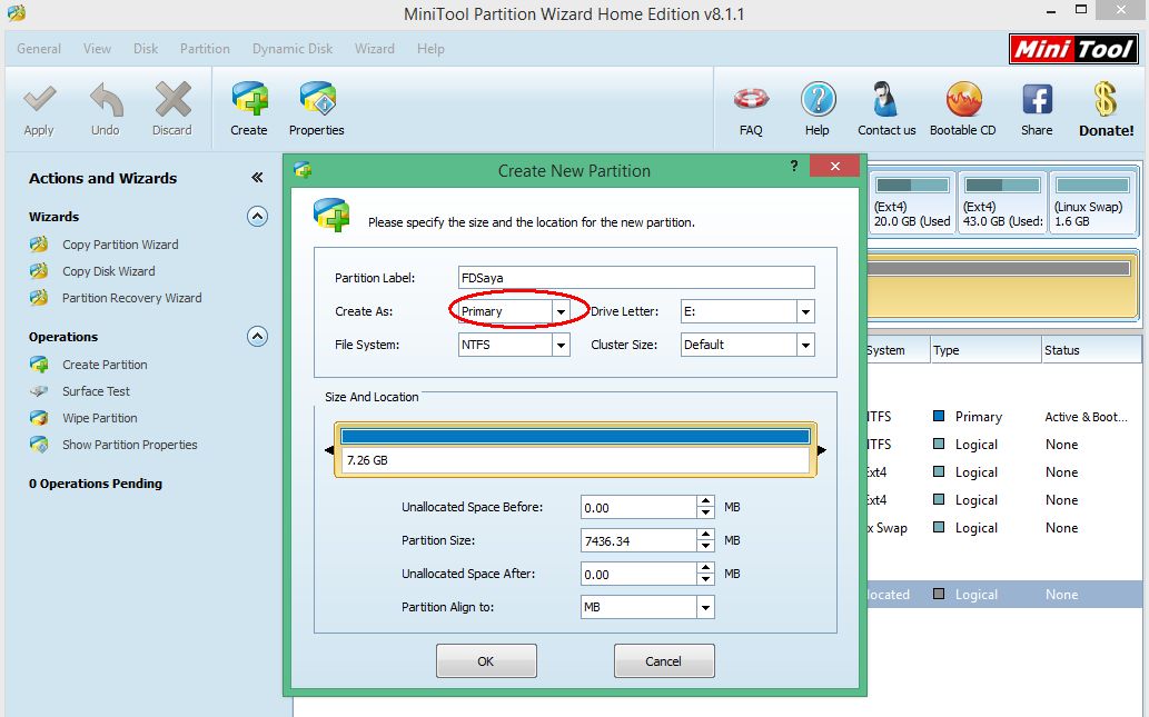 Setelah itu Anda buat kembali partisi FD Anda. Jangan lupas set partisi sebagai primary.