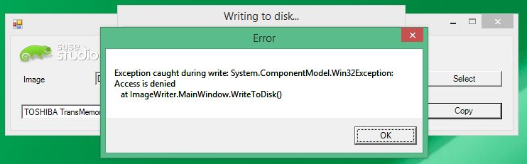 Kemudian klik Copy, maka proses pembuatan booting via FD dari ImageWriter akan segara diproses. Jika Anda mengalami galat (error) seperti gambar berikut: