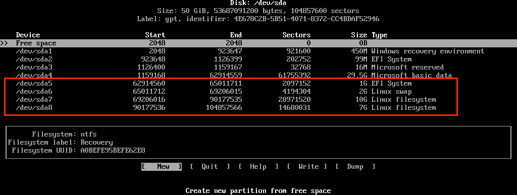 Asumsi Anda memiliki storage sebesar 20 GB, kita bagi paling sedikit 2 buah partisi yang wajib Anda buat yakni partisi ESP dan Root. Di sini saya mencontohkan kita buat 4 buah partisi yakni ESP, Swap, Root dan Home.
