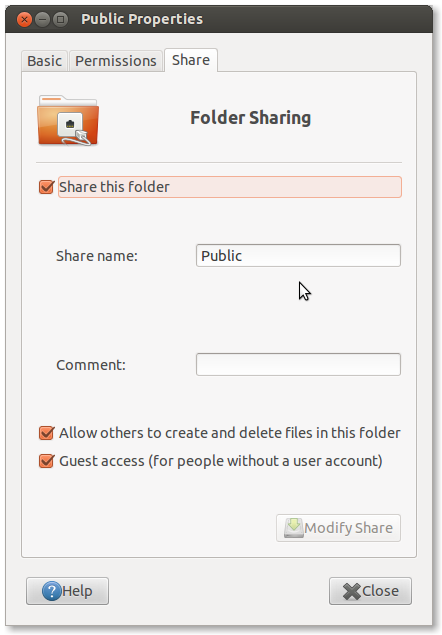 Pengguna Ubuntu bisa langsung klik kanan pada directory Anda lalu, tab Share seperti gambar berikut: