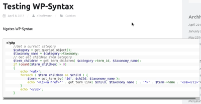 Apakah Anda seorang pengguna WordPress yang menggunakan plugin WP-Syntax untuk menangani persoalan syntax-highlighter? Pernahkan mengalami pada saat cursor mouse di dekatkan (hover) dengan textbox syntax-highlighter-nya tiba-tiba ia melebar dengan sendirinya? Fitur tersebut sebetulnya berfungsi agar kita tidak perlu lagi horizontal scroll, karena ia otomatis melebar. Akan tetapi dengan fitur tersebut membuat tema di WP kita menjadi kurang eye-catching.