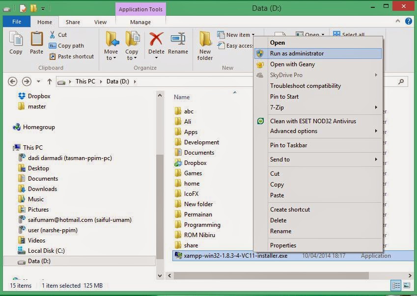 Saya asumsikan Anda sudah selesai mengunduh XAMPP versi Windows jadi langkah selanjutnya adalah menjalankanya. Jalankan instalasi XAMPP dengan mengklik kanan dan run as administrator.