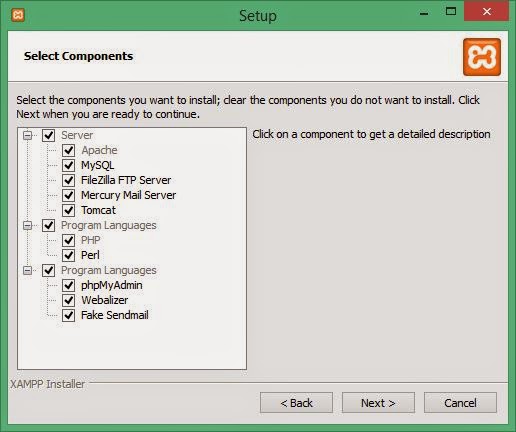Kemudian Anda bisa sesuaikan kebutuhkan XAMPP apa saja yang nantinya akan Anda instal, diartikel ini kita instal semua sesuai dengan default dari installer XAMPP tersebut.