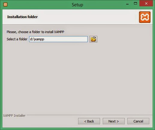 Pilih direktori mana XAMPP yang akan Anda instal. Di Artikel ini saya meletakan XAMPP di D:</b> alasannya XAMPP itu bersifat portable, artinya jika suatu saat saya menginstal ulang Windows, saya tidak perlu khawatir lagi akan hilangnya data XAMPP saya, karena sudah diletakan di drive D:</b>