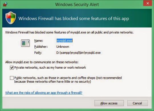 Maka berikan akses dengan mengklik Allow access agar Mysql atau Apache bisa berjalan dengan sebagaimana mestinya.