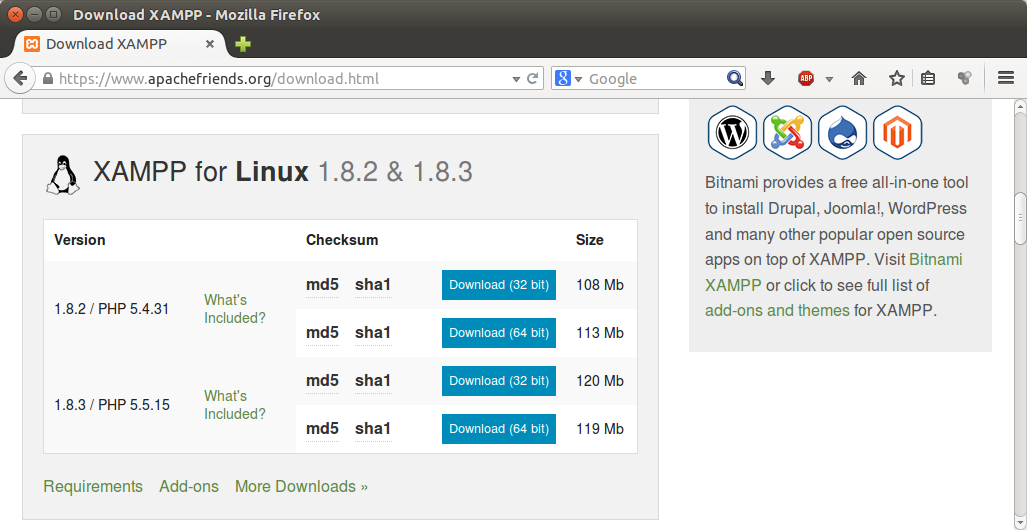 Kemudian Pilih Linux disesuaikan dengan Linux yg Anda gunakan saat ini, apakah 32bit atau 64bit. Dan disarankan unduh versi XAMPP yang terbaru.
